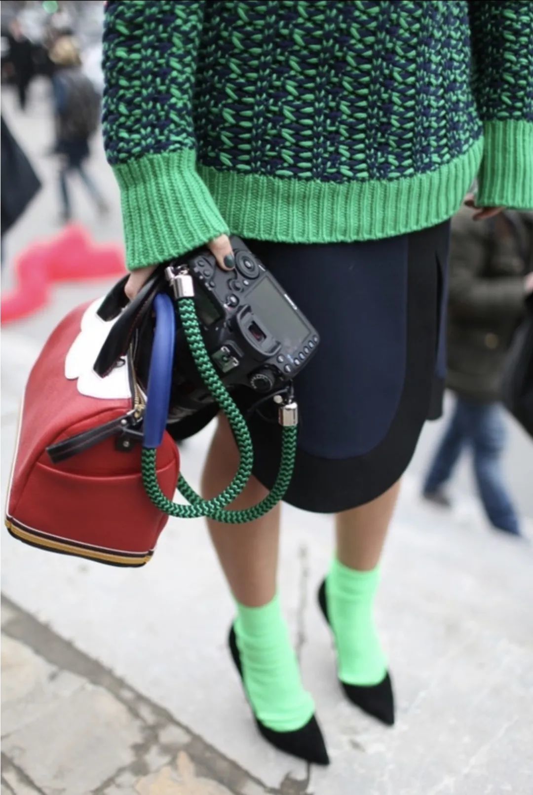 荧光色单品一直是一个比较容易踩雷的区域,让很多人对荧光的元素望而却步。其实不然,荧光色很适合用于小面积的单品,来作为整套穿搭的巧妙点缀,一个荧光色的包、袜子经常能作为将时尚感发挥到极致的单品。但与之呼应的,往往都是一些低调的搭配。在日常穿搭中,如果想要选择荧光色的袜子,应该尽量要避免搭配一双同样高饱和颜色的鞋子,选择一些存在感较低的颜色。