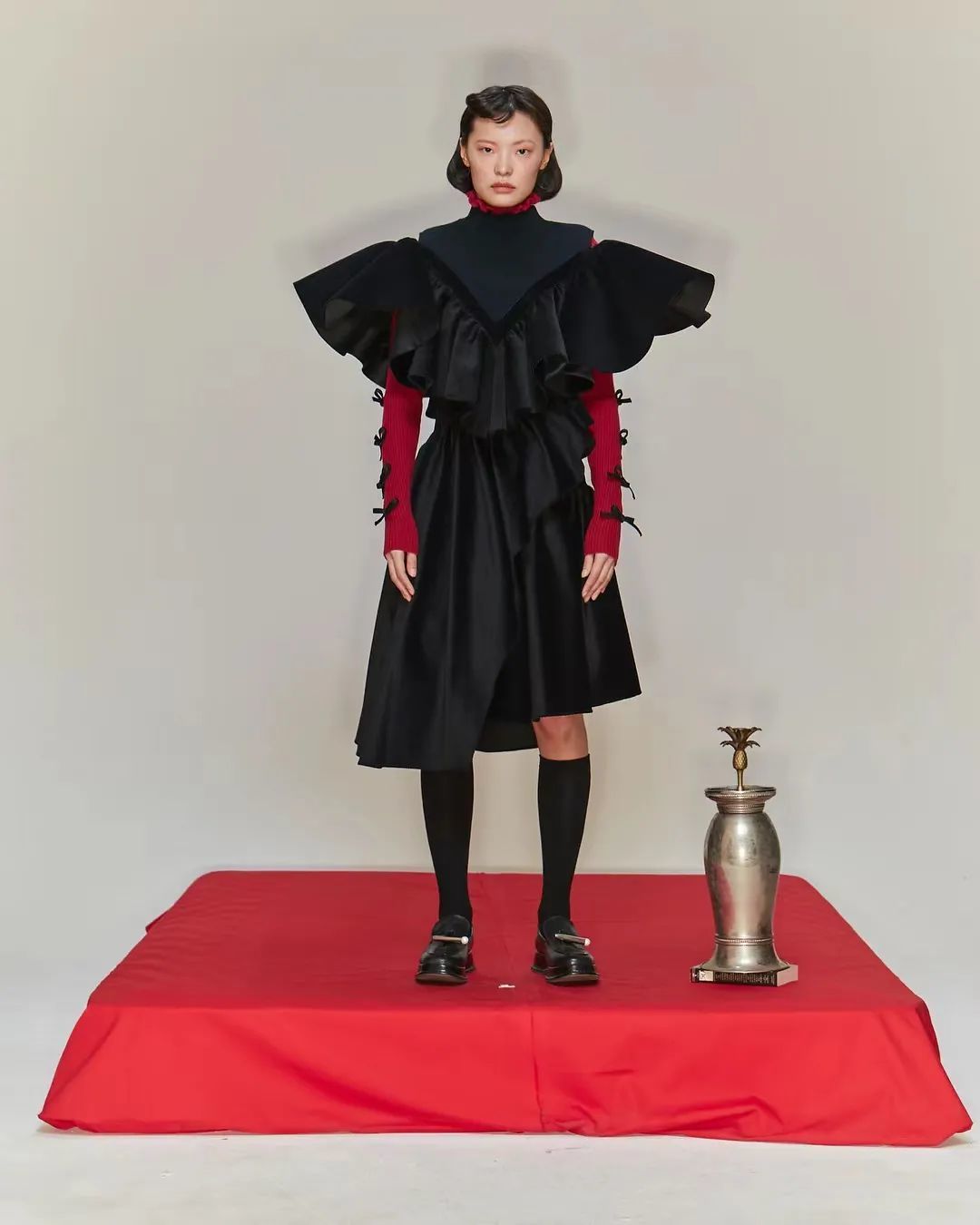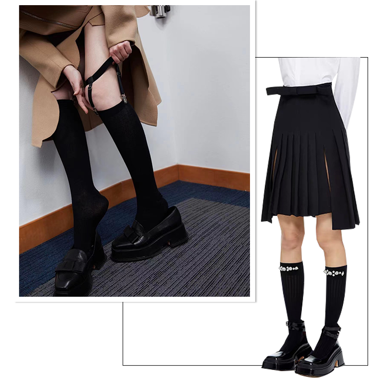 及膝袜的身影无论在舞台上还是日常中,都已经非常普遍。但对于及膝袜的搭配,也很容易“踩雷”。在鞋子的搭配上,尽量选择同色系或接近色系的鞋子,才能让腿部线条在视觉上看起来更加流畅,起到修饰腿型的作用。除此之外,对于下半身的穿搭选择也需要慎重。百褶裙和及膝袜这种经典的搭配公式提醒我们,下半身尽量选择短一点的单品。