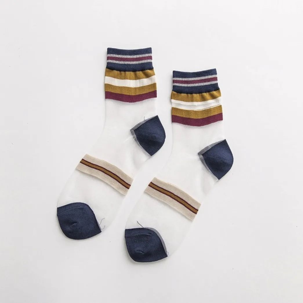 玻璃袜作为时下最热门的袜子款式之一,因为其半透视的独特设计从一众的袜子中脱颖而出。区别于传统丝袜的单一沉闷,玻璃袜上许多不同花纹图案的彩色设计让它瞬间充满了活力。除此之外,玻璃袜独特的半透视材质无论是从穿着感受还是视觉上,都给人一种清新亮眼的感觉。