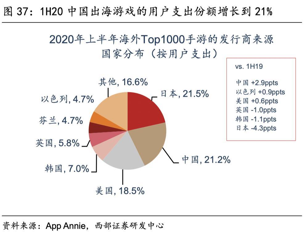 2019年,中国出海游戏收入规模达到115.9亿美元,同比增长20%;海外市场收入同比增长均达到20%-40%,用户支出占海外移动游戏市场的份额从2019年的19%增长到2020年的21%,比第一名的日本仅落后0.3%,不出意外中国将有可能在今年超越日本,登顶全球榜首。
