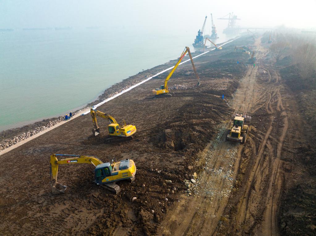 长江干流江西段崩岸应急治理工程梁公堤施工段建设现场。(江西水利厅 供图)