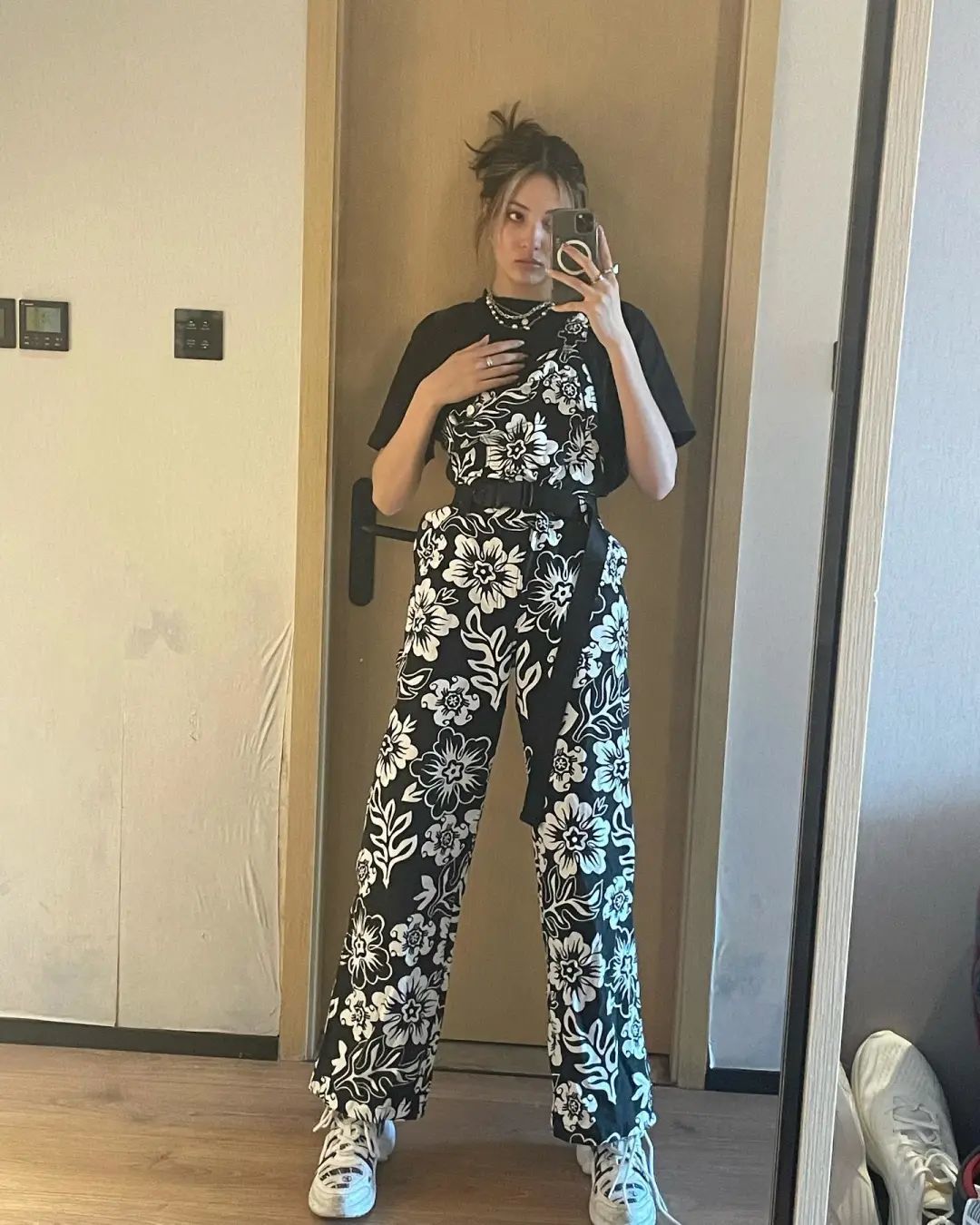大面积的印花连体裤也能完美驾驭。