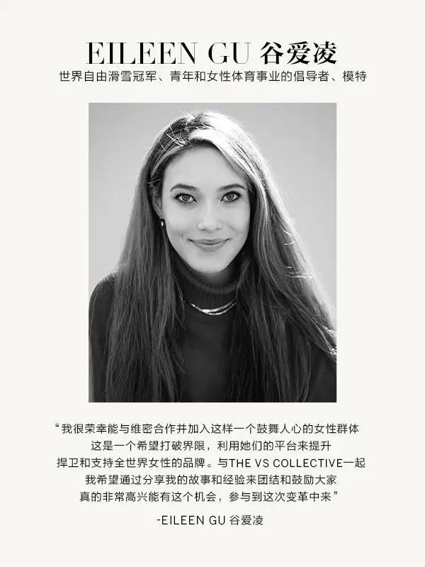 Victoria's Secret维多利亚的秘密也宣布谷爱凌成为 The VS Collective 团体的一员,以品牌形象大使的身份参与到品牌的全新变革中去。