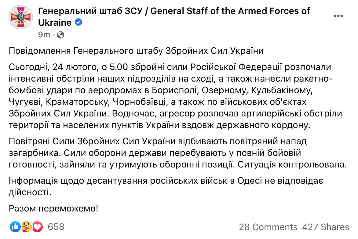 乌军总参谋部称:“今天,2月24日凌晨5点,俄罗斯联邦武装部队开始对我在东部的部队进行猛烈炮击,并对鲍里斯波尔、奥泽尔诺耶、库尔巴金、楚格耶夫、克拉马托尔斯克、乔尔诺巴耶夫卡等机场及军事设施进行火箭弹和炸弹袭击。与此同时,侵略者开始炮击乌克兰国界沿线的领土和定居点。乌克兰武装部队空军正在击退入侵者的空袭。国防军处于全面战备状态,并采取防御阵势。局势已得到控制。有关俄罗斯军队在敖德萨登陆的信息不属实。让我们一起胜利! ”