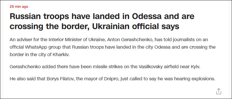 据CNN报道,乌克兰内政部长的顾问安东·格拉先科(Anton Gerashchenko)在一个官方WhatsApp群组中向记者确认,俄军已登陆乌克兰敖德萨,突破哈尔科夫州界。