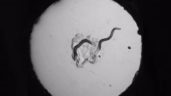 被左边的掠食性线虫咬伤后,右边的秀丽隐杆线虫连忙逃跑 | Salk Institute