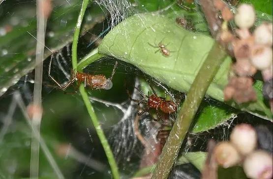 和单独捕猎相比,群居蜘蛛共同攻击猎物时,能抓到的猎物要大得多。但是,上百上千只蜘蛛,如何有组织地发起攻击呢?