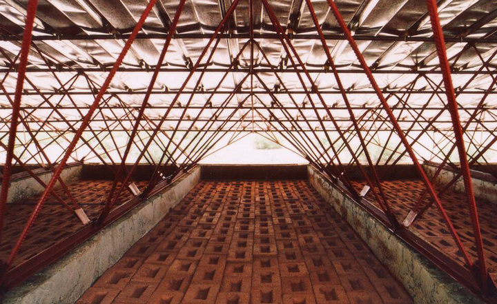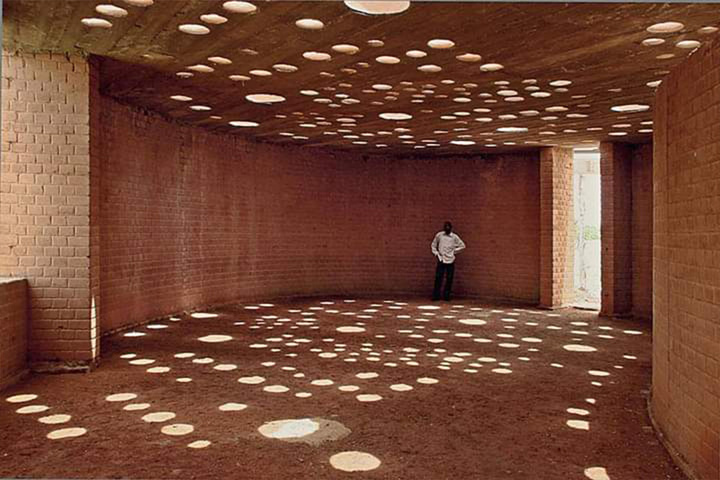 最后在 2001 年完工的学校建筑除了用粘土制砖块建造的墙壁,还有宽阔的铁皮屋顶,用来为建筑遮风挡雨。这个铁皮屋顶事实上用的是极其廉价的钢条,这些钢条通常只会用在混凝土根本看不到的内部。