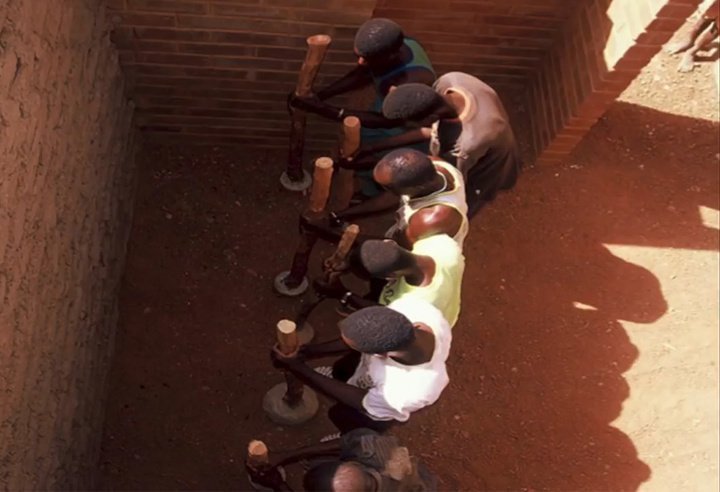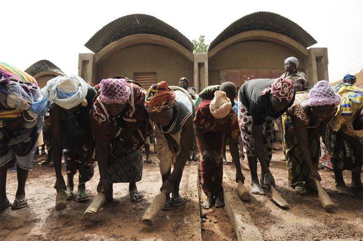 不过当大家都同意按照凯雷先生的设计方案建造学校后,不可思议的一幕出现了——村里的每个人都参与到学校的施工之中。以捶打粘土地面为例,成年男性站着捶打几个小时之后,他们的母亲会来接替他们继续捶打。