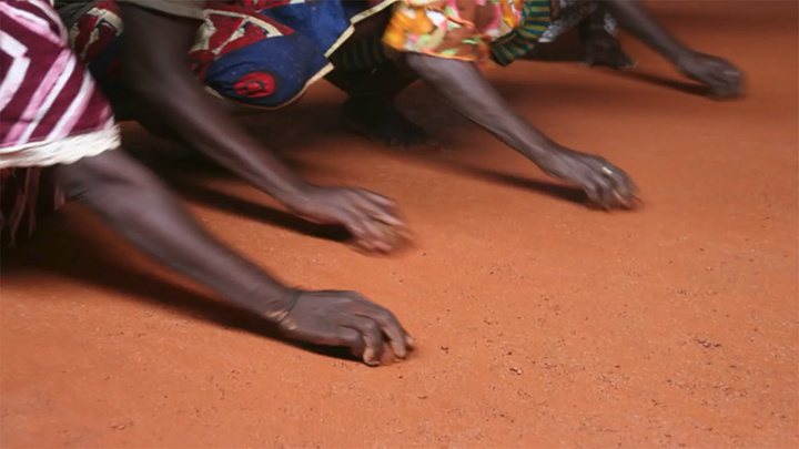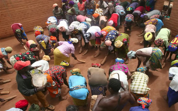 ▲ 捶打粘土地面的男性村民和他们的母亲. 图片来自:YouTube @TED