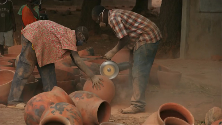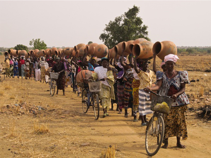 资源贫乏的甘多,却盛产陶土罐。为了帮助凯雷先生建造图书馆,当地女性制作好陶土罐,排着队头顶着大大的陶土罐送到施工现场。