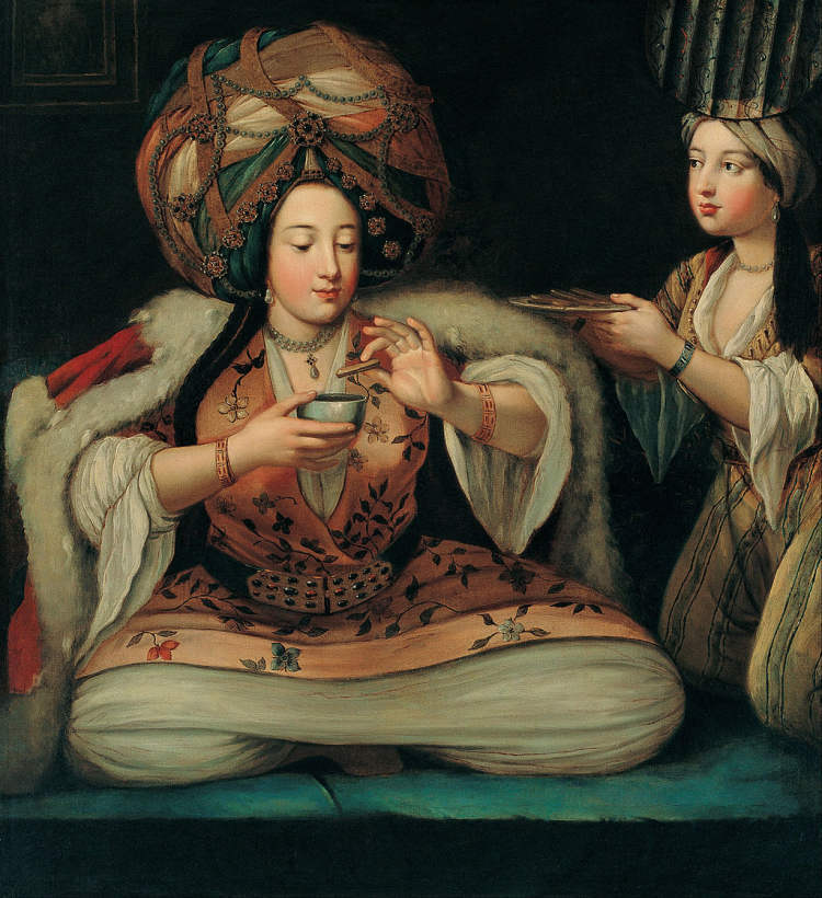 古典画作中喝咖啡的奥斯曼宫廷妇人。