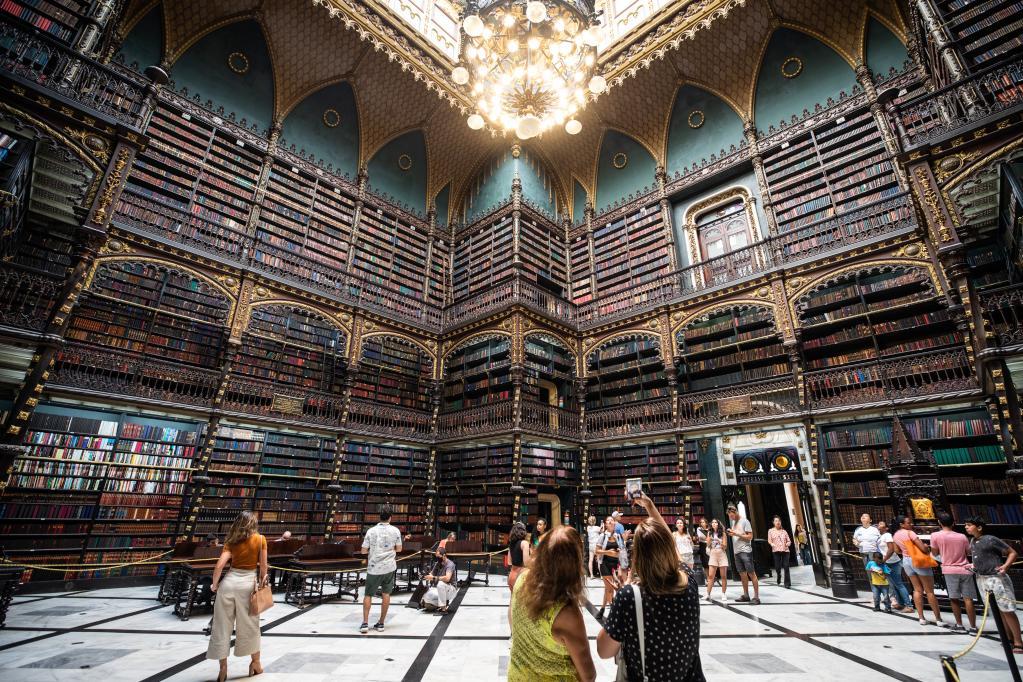 4月19日,在巴西里约热内卢,人们在皇家葡文图书馆内参观拍照。